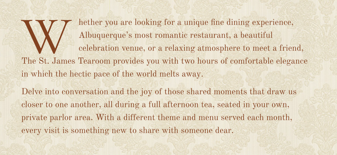 Where the Rocky Mountains lie by the Rio Grande at the simple elevation of one mile rests The St. James Tearoom. People from all around relax in unique and quiet nooks to enjoy Afternoon Tea—excellent tea, tier of delicacies, gracious service, and the promise of good conversation.